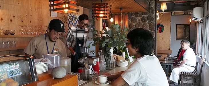 夕暮れの庭を歩くようにしてまちを巡り、作庭中のアーティスト(L PACK.)のスペースにも立ち寄ってコーヒーを頂きながら、お話を伺います。