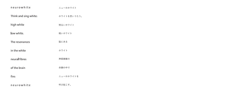 今回は、「ニューロ・ホワイト / 神経系の白」というテキストと作家本人から発せられる「声」そのものを通して、その場に居合わせた人々と「神経色の空間」を共有します。